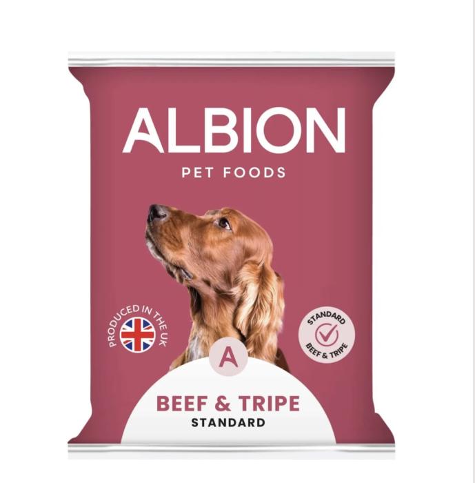 Albion Standard Beef & Tripe is a complementary feed formulated for working and assistance dogs, made from 50% beef and 50% finely minced tripe. This should be fed as part of a varied, balanced diet and supplemented with other ingredients such offal, fruit and vegetables.